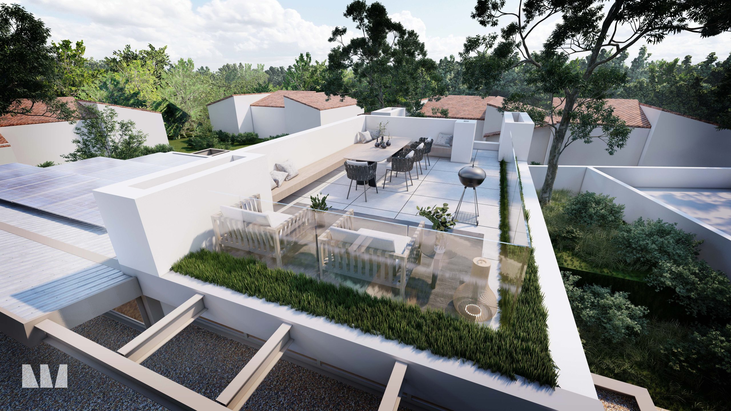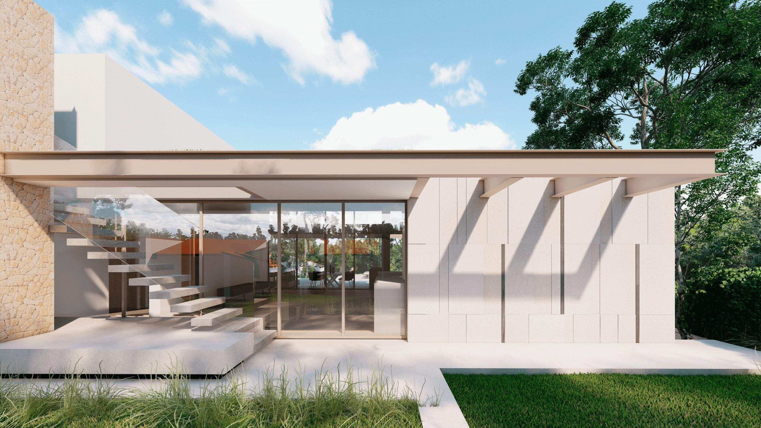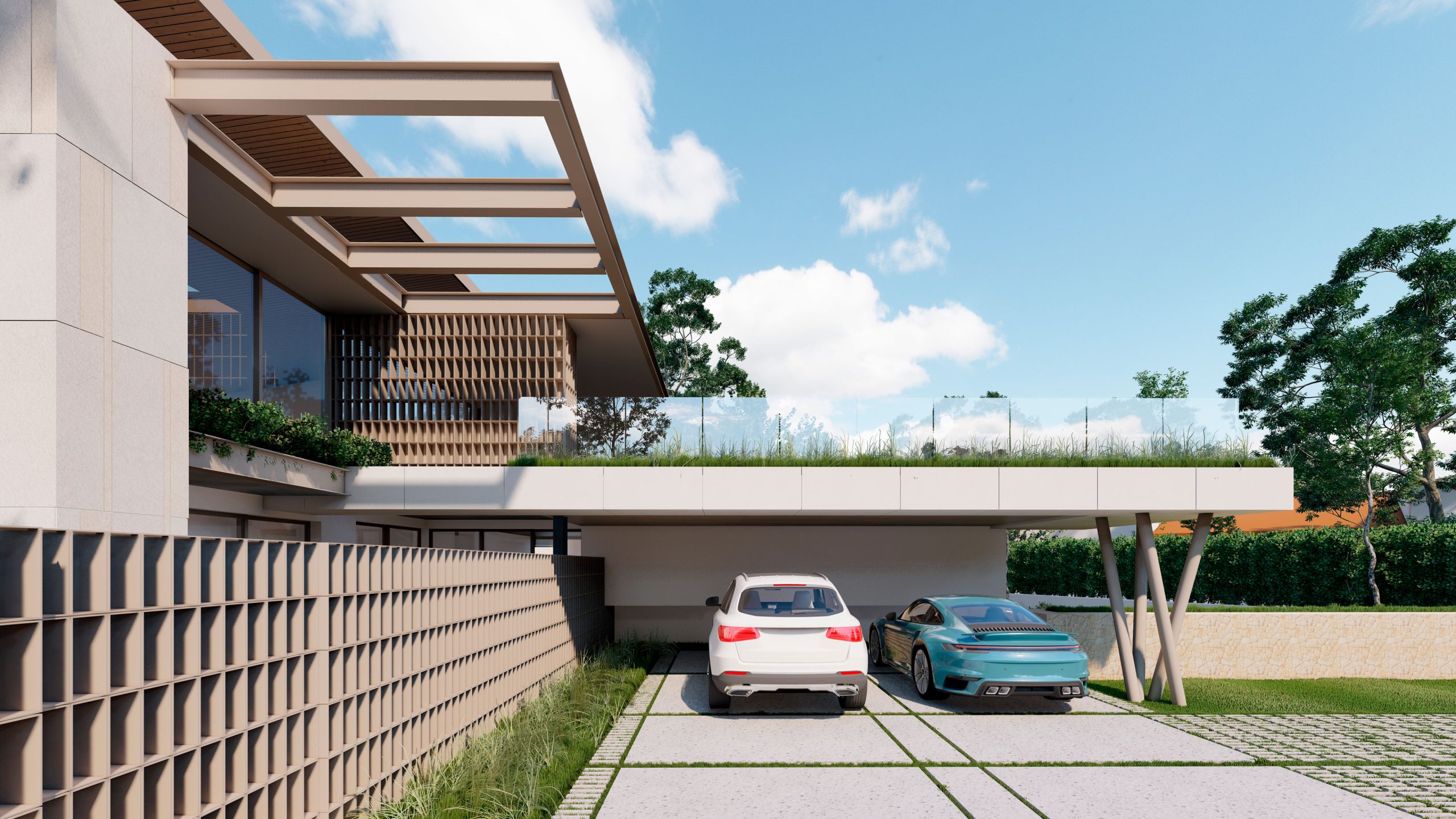 The villa will be built over two floors. The lower floor, just below street level, will feature three bedrooms, each with its own en-suite bathroom, a separate guest toilet, and a laundry room. Floor-to-ceiling windows provide each bedroom with direct access to the garden, blending indoor and outdoor living. This level will also include a spacious carport for two cars.