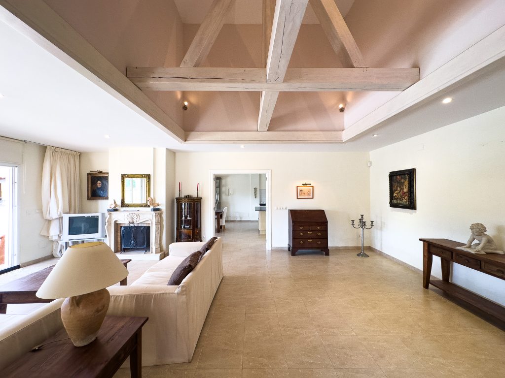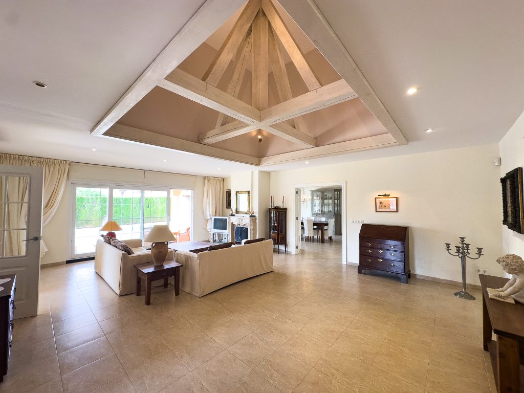Inside, the living room impresses with its generous size, large sliding glass doors overlooking the pool area, and a distinctive elevated ceiling adorned with solid wooden beams, creating a spacious and premium ambiance. Adjacent to the living room is the open-plan kitchen and dining area, equipped with top-quality finishes and elegant granite countertops. A convenient washing room is tucked away behind the kitchen, keeping laundry and linens neatly out of sight yet easily accessible.